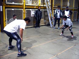 B日記 2003年10月26日続き ●コントロールテスト 合宿の締めくくりはコントロールテスト。 運動能力を測定します。 前日からの合宿メニューをこなした後でやや疲労気味でしたが最後の力を振り絞って皆がんばりました! 今年からスケルトン用の種目が設定。 <種目> ・20m走 ・メディシンボール投げ(フロント・バック) ・垂直跳び ・反復横跳び (・立ち幅跳び) でも。。。 身長差が30cm以上ある羽入田選手と私達では反復横跳びのツラさが違うと思う〜